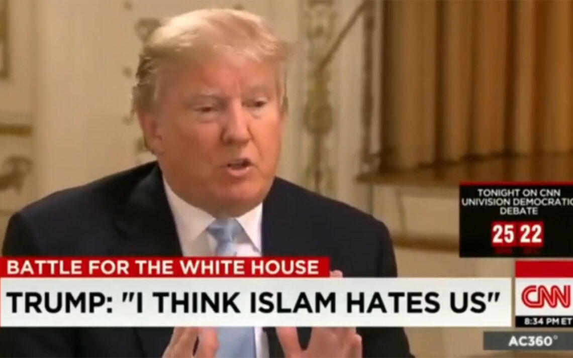 I CNNs Anderson Coopers intervju med ham i mars 2016 tenker Trump, den gang presidentkandidat, høyt om islams forhold til den kristne verden: