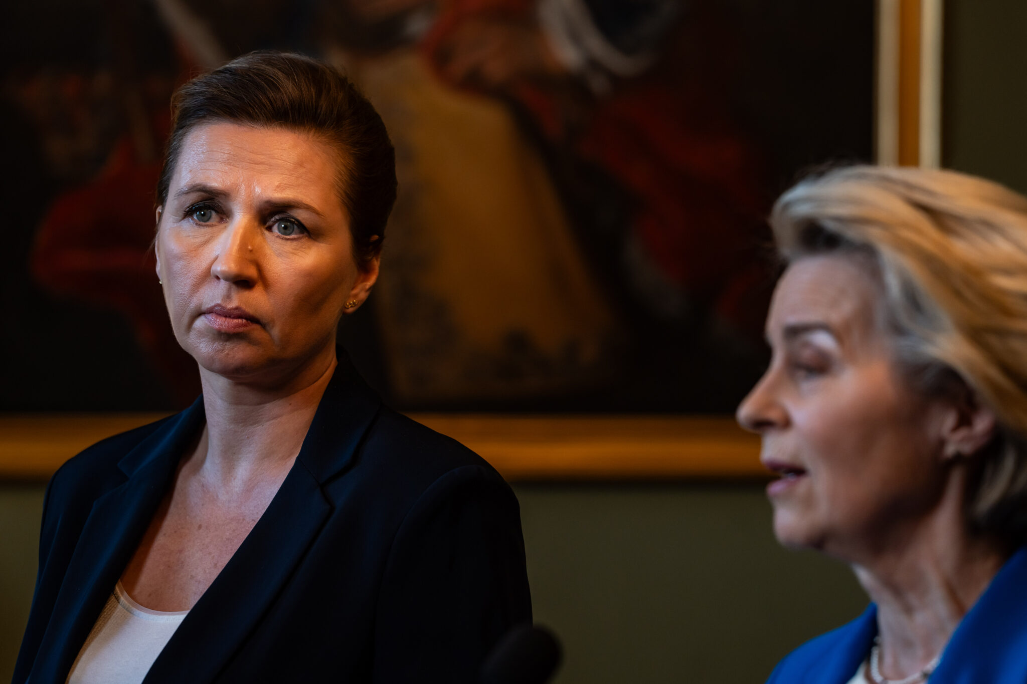Danmarks statsminister Mette Frederiksen og EU-kommisjonens president Ursula von der Leyen på Hærens Officersskole på Frederiksberg Slot i København den 18. mars 2025. Foto: Emil Nicolai Helms / Ritzau Scanpix / NTB.