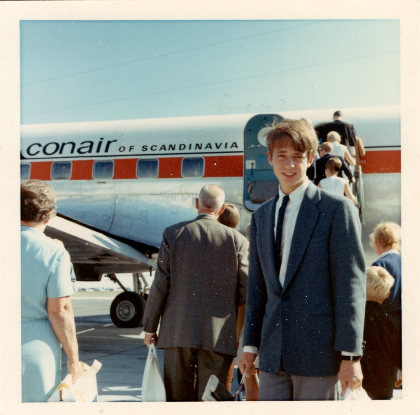 Artikkelforfatteren på sin første flytur, nesten 16 år, sommeren 1968. Det var propellfly, og mye mindre flyterminaler enn nå. Men koselige kunne de ikke beskyldes for å være. Foto: Privat