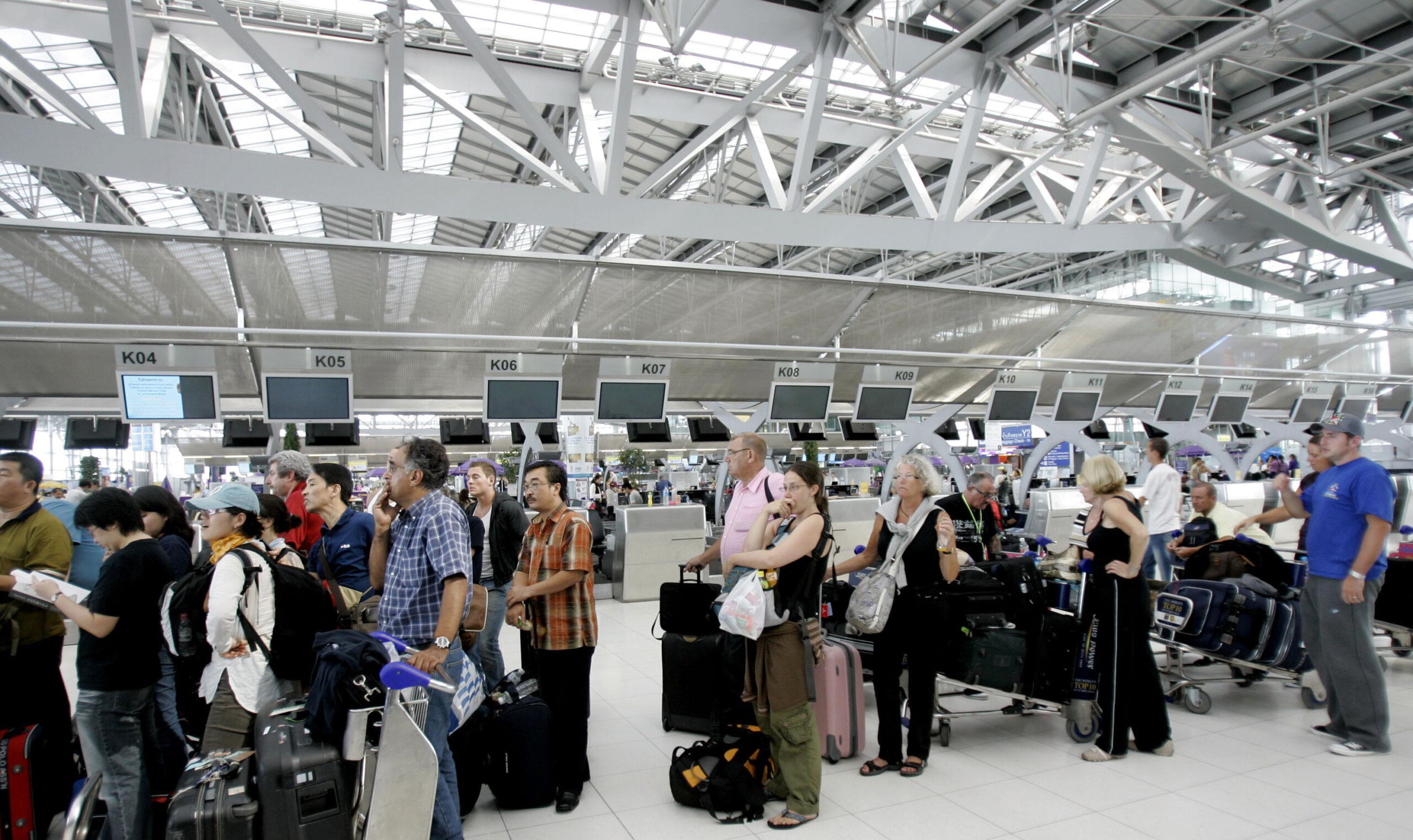 Lange køer på Bangkoks hovedflyplass, Suvarnabhumi international airport. Foto: Apichart Weerawong / AP / NTB