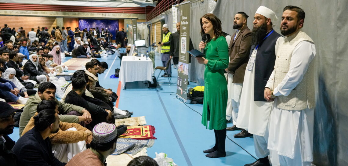 Tonje Brenna (Ap) kaster glans over en eid-markering i Skedsmohallen i Lillestrøm søndag 30. mars, og føyer seg med det inn i den lange og skamfulle rekken av norske politikere som gjør stas på islam. Selv har hun tatt av seg skoene, hvilket vel betyr at det som normalt er en idrettshall, der og da er å anse som en moské, hvor man stiller på sokkelesten. Den regelen ser dog ikke ut til å gjelde de ganske morske islamfunksjonærene som står bak henne, mens hun taler til en forsamling der de aller færreste nordmenn ville ha følt seg vel til pass. Brenna er arbeids- og «inkluderings»-minister, der man kanskje ville ha sett for seg at det er såkalte minoriteter som inkluderes i Norge. Her virker Ap-statsråden selv snarere nokså inkludert i islam. Foto: Terje Bendiksby / NTB.