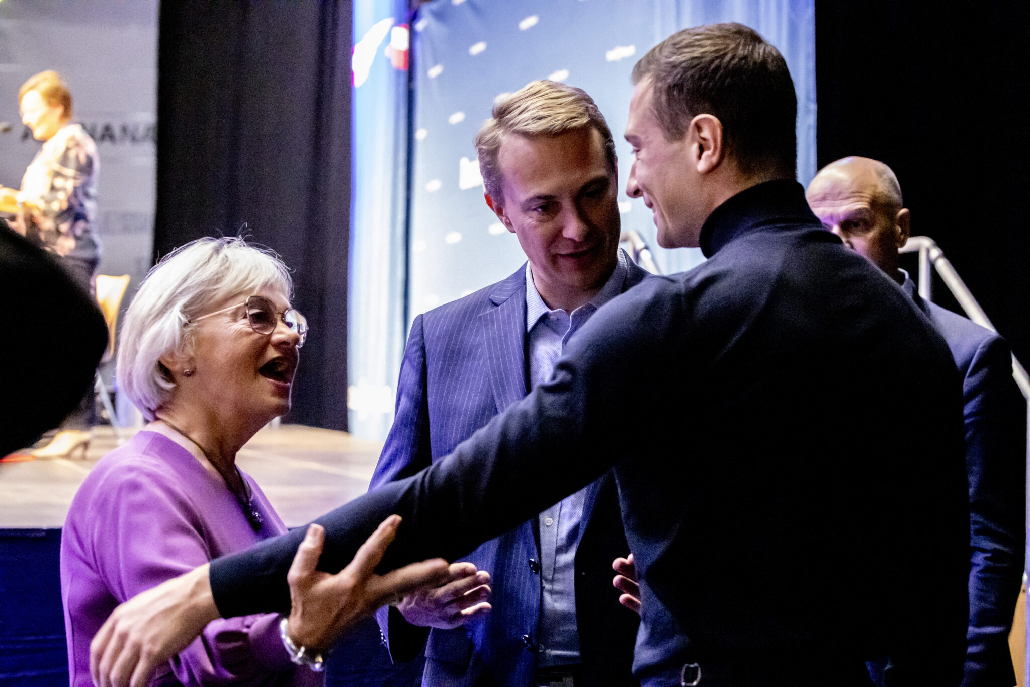 Rassemblement Nationals (RN) leder Jordan Bardella med Dansk Folkepartis (DF) leder Morten Messerschmidt og partifellen Pia Kjærsgaard under DFs landsmøte i Næstved den 28. september 2024. Foto: Ingrid Riis / Scanpix / NTB.