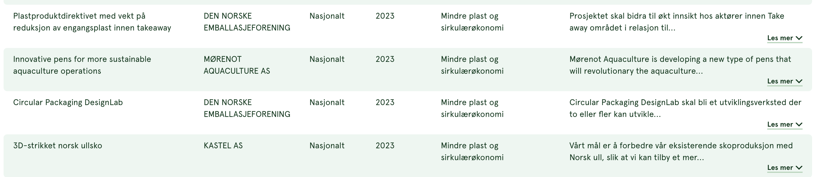 Flere av prosjektene er rettet mot barn og unge, og inkluderer formidling gjennom litteratur, scenekunst og skoleaktiviteter. Andre tiltak dreier seg om utvikling av nye produkter, avfallsløsninger eller informasjon rettet mot forbrukere og lokale aktører.