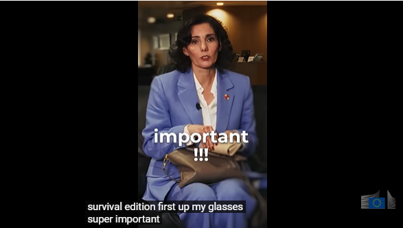 Videoen ble lagt ut på Europakommisjonens offisielle YouTube-kanal. Her ser man Hadja Lahbib, kommissær for humanitær bistand og kriserespons, trekke gjenstander ut av håndvesken sin foran et publikum som ler på kommando.