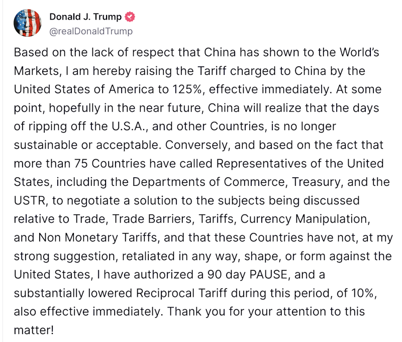 🌎90-DAY PAUSE & LOWERED 10% RECIPROCAL TARIFF FOR OTHER COUNTRIES🚨EFFECTIVE IMMEDIATELY pic.twitter.com/Gt5Bd6276m