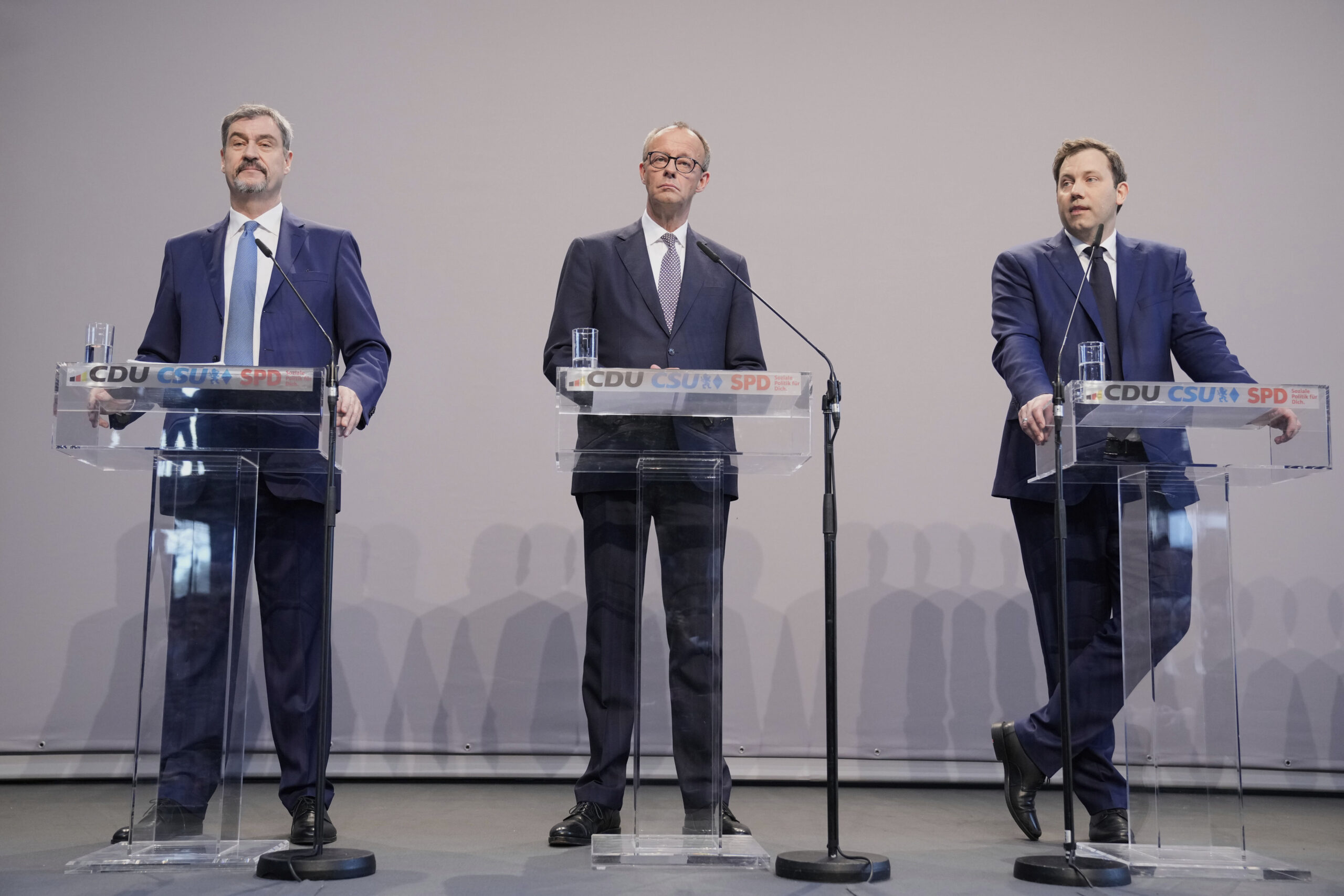 CSU-leder Markus Söder, CDU-leder Friedrich Merz og SPD-leder Lars Klingbeil møter pressen etter å ha fremforhandlet en koalisjonsavtale i Berlin den 9. april 2025. Foto: Ebrahim Noroozi / AP / NTB.