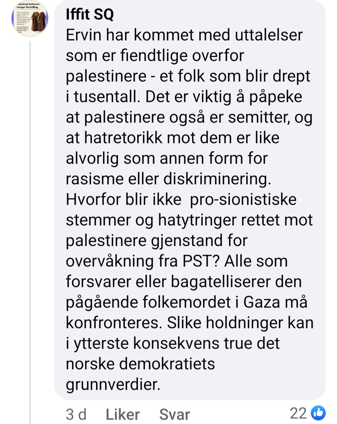 «Ervin har kommet med uttalelser som er fiendtlige overfor palestinere – et folk som blir drept i tusentall. Det er viktig å påpeke at palestinere også er semitter, og at hatretorikk mot dem er like alvorlig som annen form for rasisme eller diskriminering. Hvorfor blir ikke pro-sionistiske stemmer og hatytringer rettet mot palestinere gjenstand for overvåkning fra PST? Alle som forsvarer eller bagatelliserer den pågående folkemordet i Gaza må konfronteres. Slike holdninger kan i ytterste konsekvens true det norske demokratiets grunnverdier.»