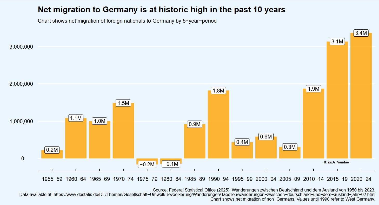 I perioden 1955–2009 var nettoinnvandringen til Tyskland 7,5 millioner personer. De siste 15 år har innvandringen altså vært høyere enn de forutgående 54 årene.