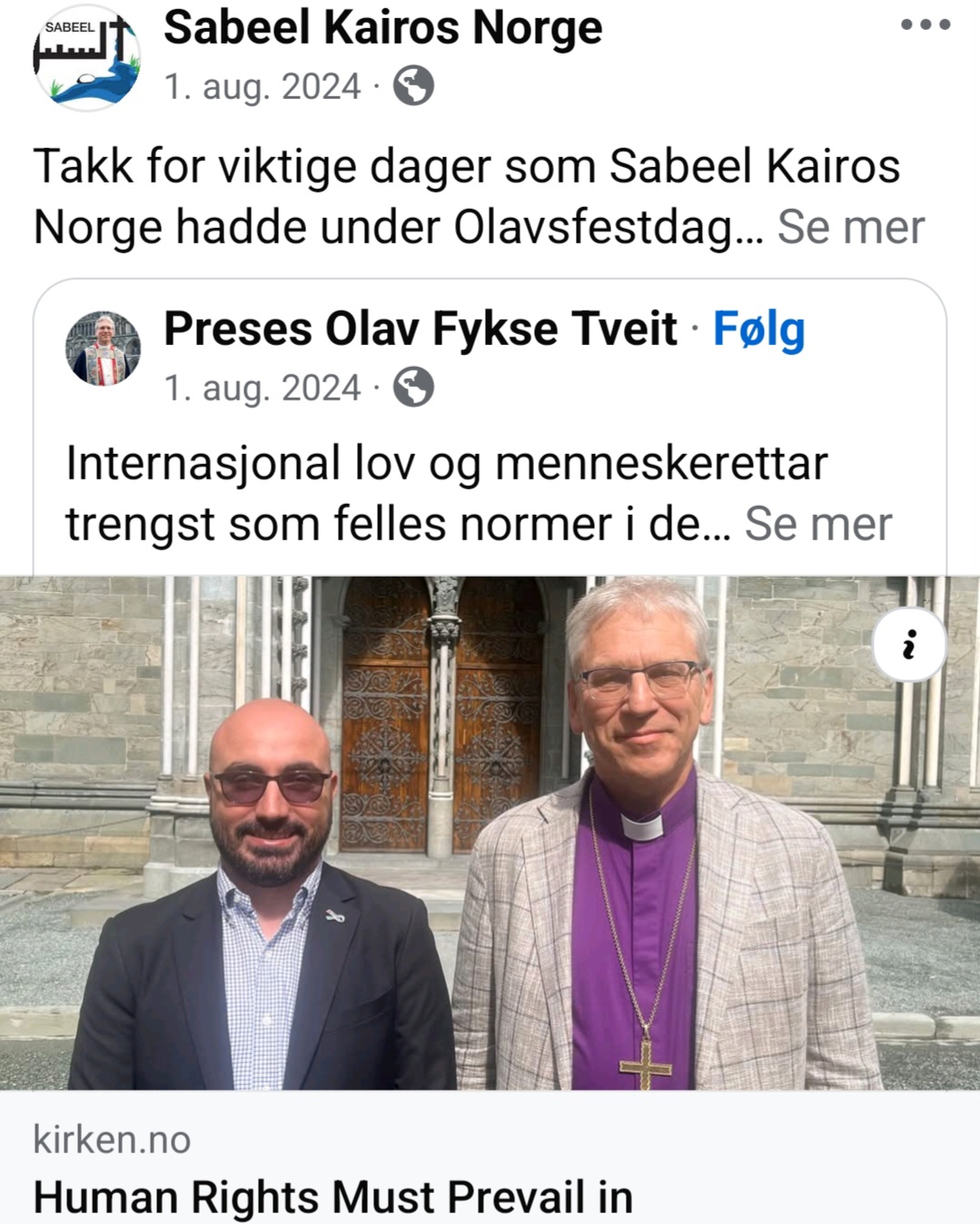 Preses Olav Fykse Tveit er opptatt av Gaza, så også Olavsfestdagene i Trondheim, og så også Sabeel Kairos Norge, som står bak boikott-oppropet. Skjermdump.