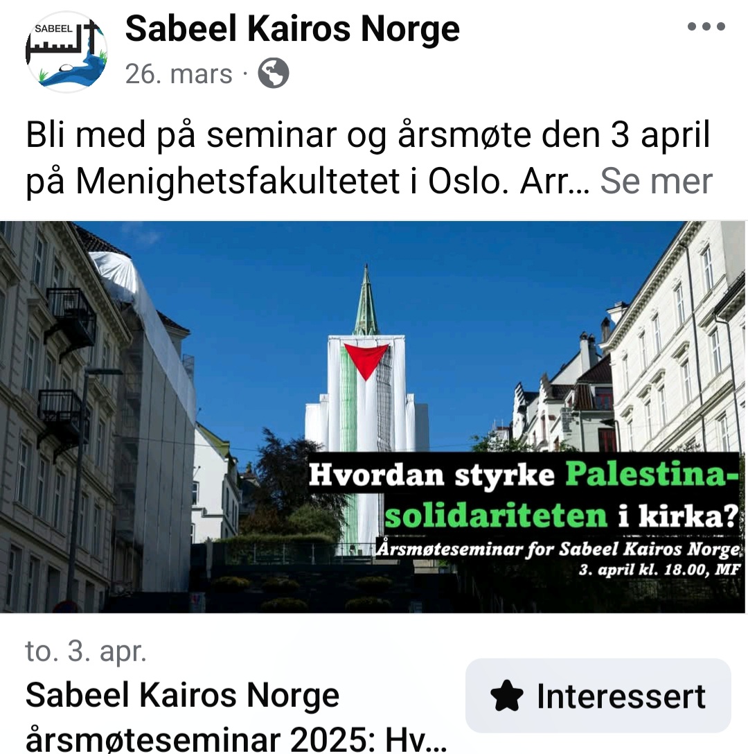 Gaza-aktivistene i Sabeel Kairos Norge får bruke Menighetsfakultetet til sine aktiviteter. Skjermdump.