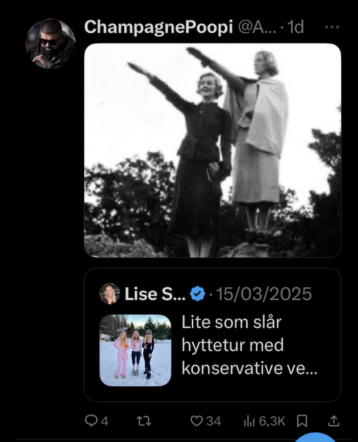 Et bilde som Documents journalist Lise Sørensen la ut på X av seg selv og to venninner var gjenstand for omtale i episoden, etter at Hussain republiserte det og sammenlignet det med et foto av kvinnelige hirdmedlemmer som gjør nazihilsen.