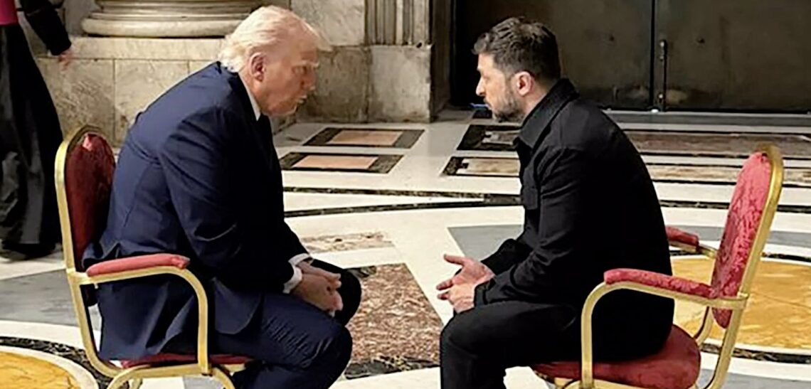 Noen bilder viser situasjoner som er så ekstraordinære at de blir historiske. Donald Trump og Volodymyr Zelenskyj som snakker sammen inne i Peterskirken før pave Frans’ begravelse mens Ukraina-krigen fremdeles pågår, er singulært. Det er som om pavens siste reise kan bidra til freden han så sterkt ønsket. Skjermdump: RAI.