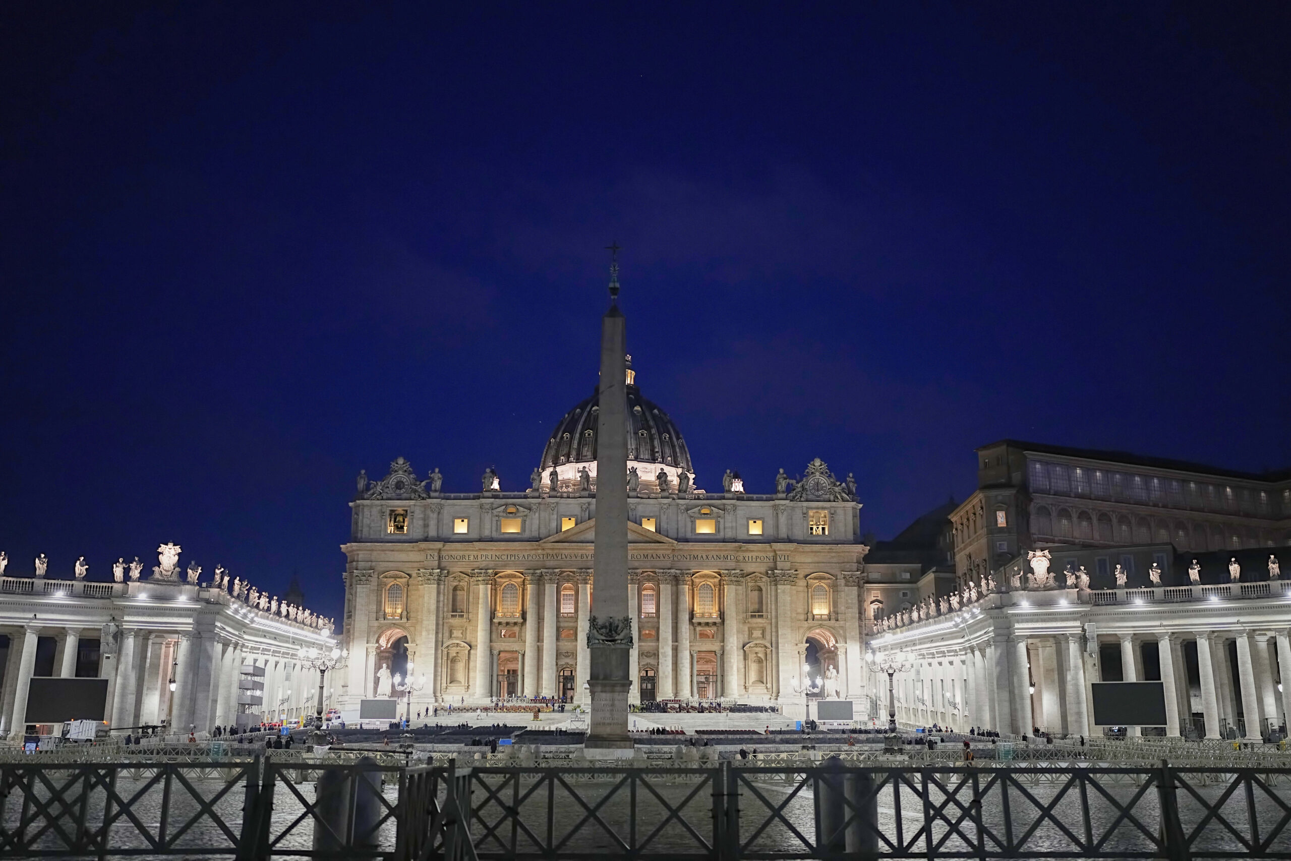 Utsikt til Peterskirken før soloppgang den 26. april 2025. Foto: Andreea Alexandru / AP / NTB.