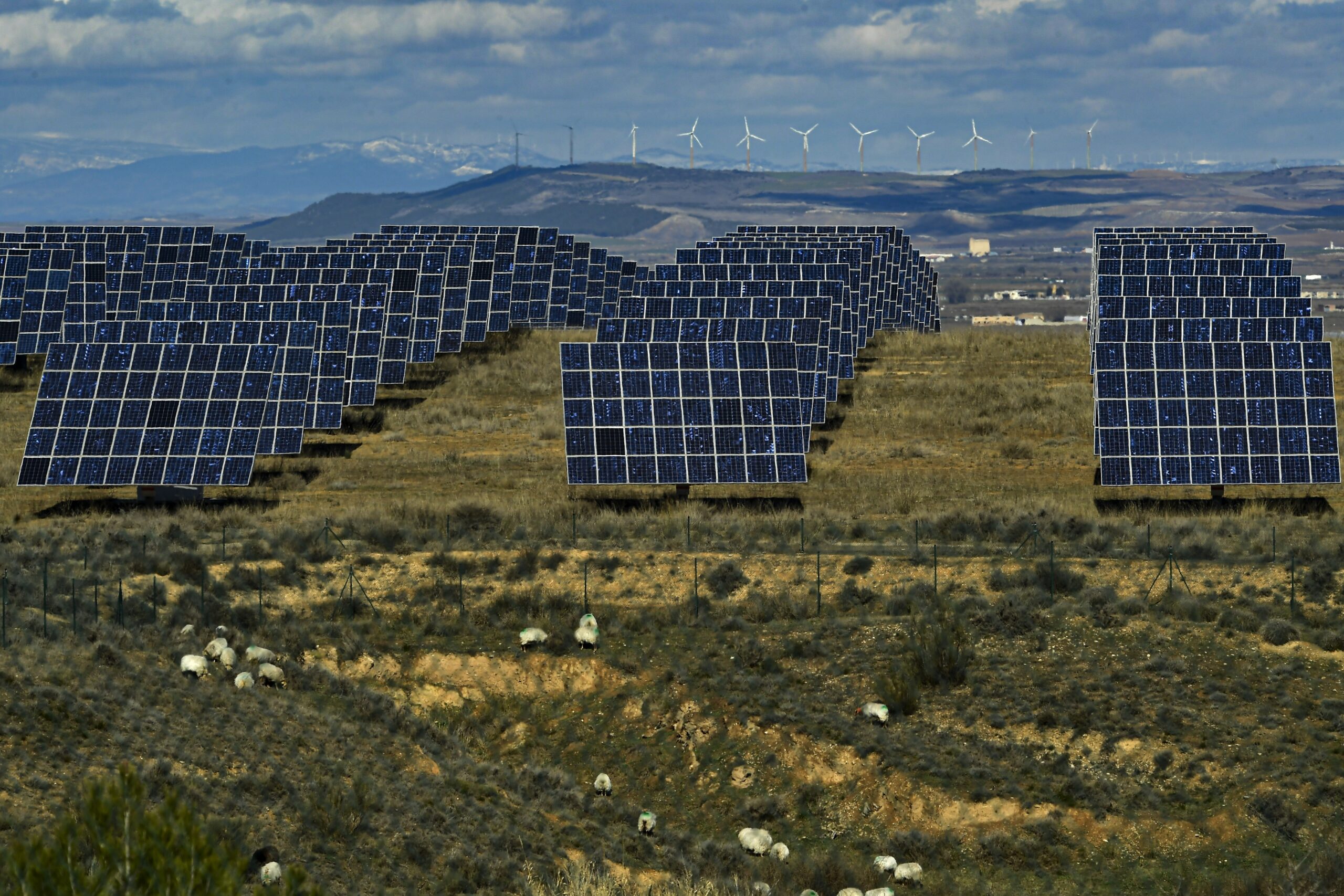 Utsikt til en solpark og en vindpark ved Milagro i den nordspanske Navarra-provinsen den 24. februar 2023. Foto: Alvaro Barrientos / AP / NTB.