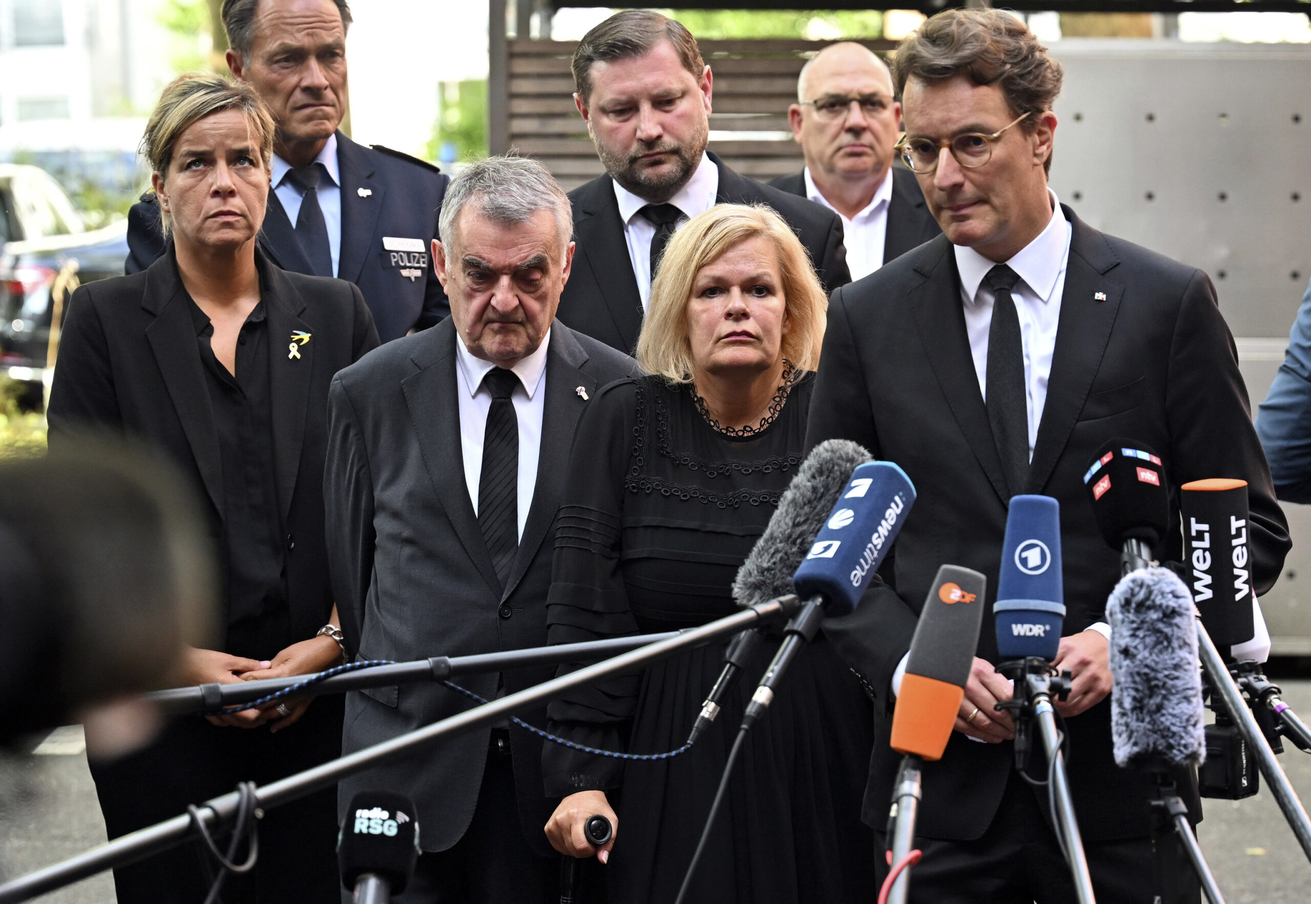 Tysklands innenriksminister Herbert Reul og delstatens ministerpresident Hendrik Wüst kommenterer terrorangrepet i Solingen den 24. august 2024. Foto: Henning Kaiser / DPA via AP / NTB.