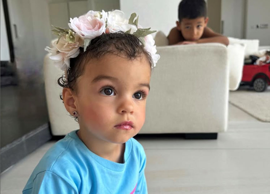 Cristiano Ronaldo har fem barn: Cristiano Ronaldo Jr. (2010), Eva Maria og Mateo (tvillinger 2017), Alana Martina (2017) og lille Bella Esmeralda (2022, bildet). Instagram