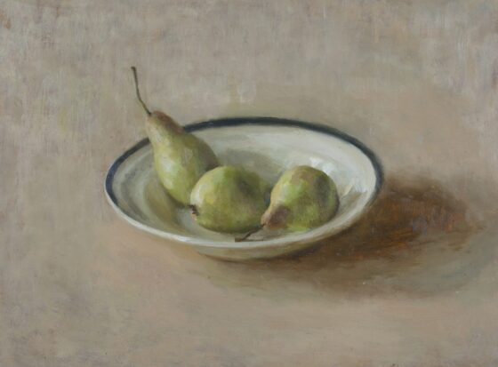 Roald Sivertsen, «Pærer», 2025, 30 × 40 cm, olje på tre. Utstilling: Vekten av skygge, 8. mai – 1. juni 2025, Galleri Semmingsen. Foto: Galleri Semmingsen