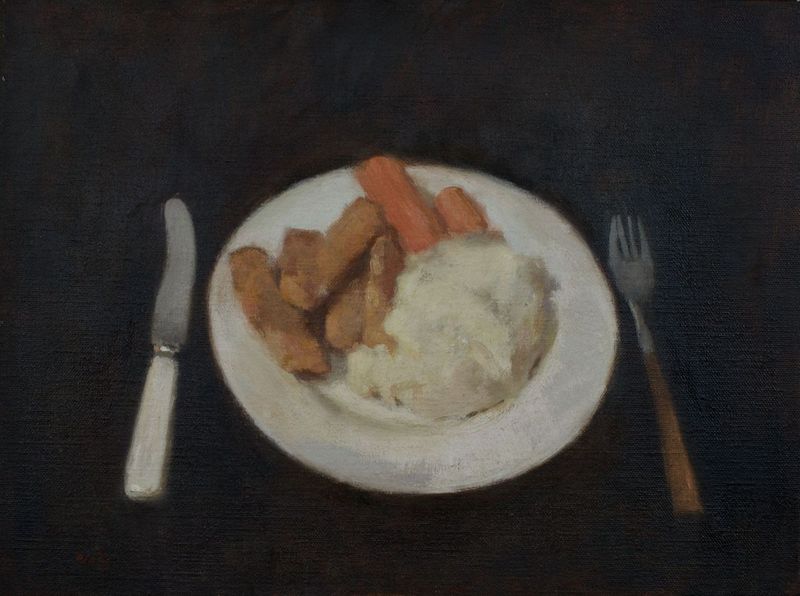 Roald Sivertsen, «Middag», 2023, 30 × 40 cm, olje på lerret. Utstilling: Vekten av skygge, 8. mai – 1. juni 2025, Galleri Semmingsen. Foto: Galleri Semmingsen