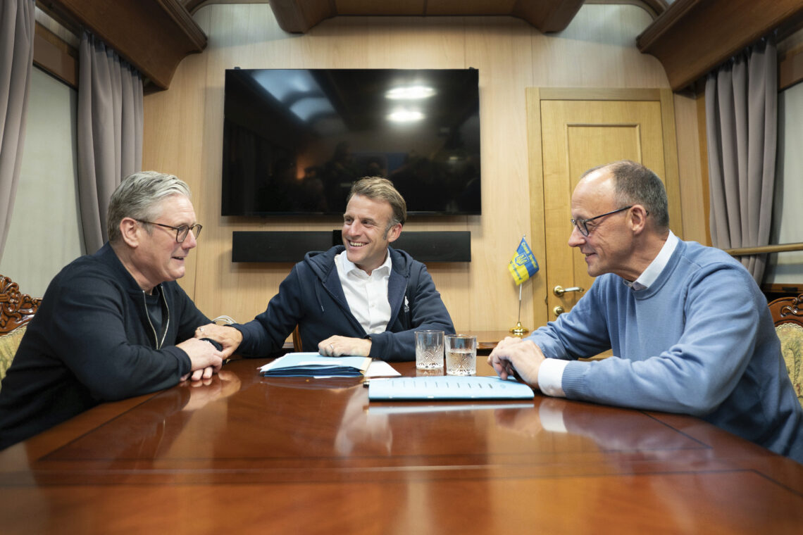 Imens kommer det film fra toget til Kyiv, der bildene kan tolkes som at Macron forsøker å skjule en pakke kokain.