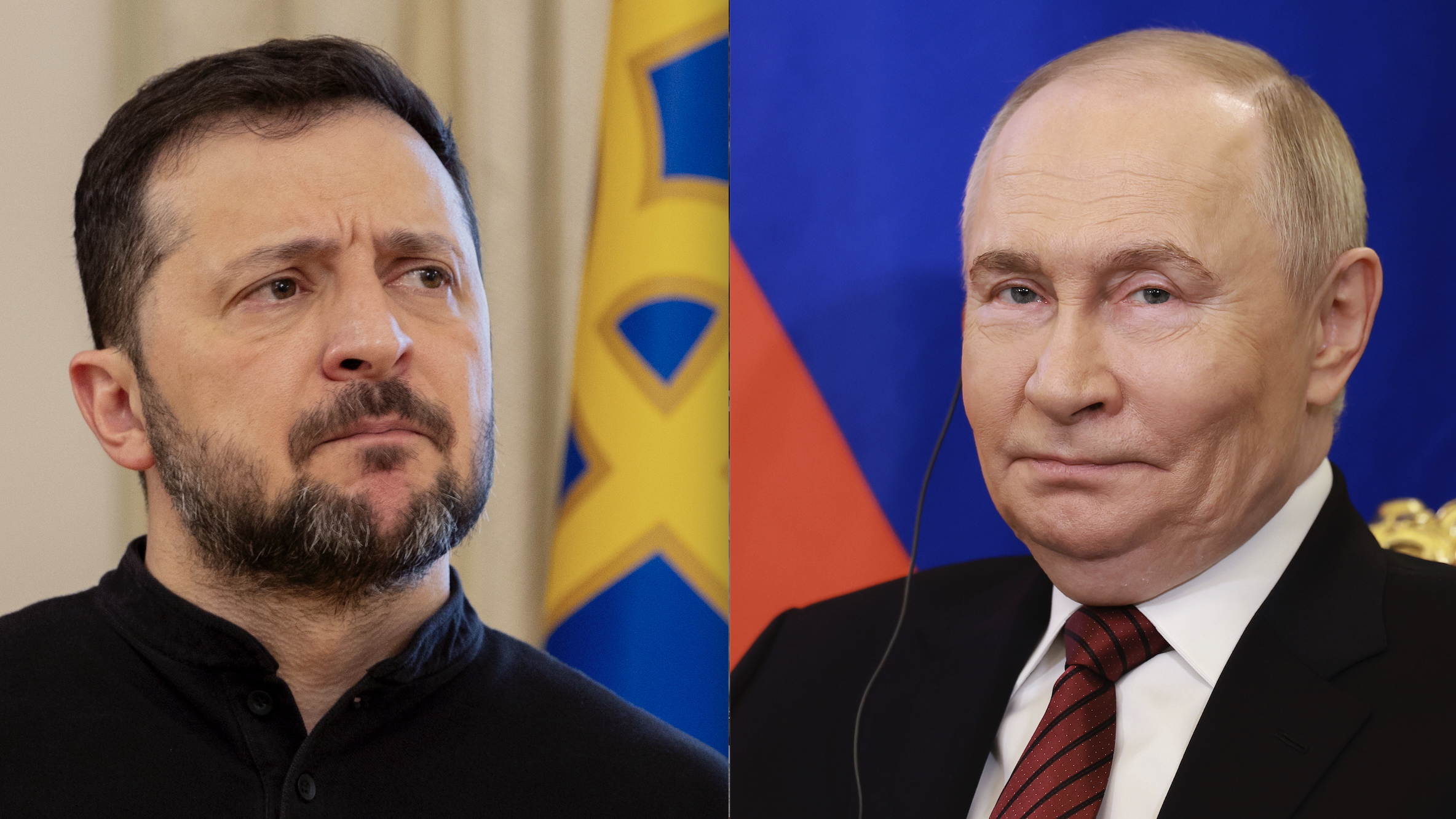 T.v. Volodymyr Zelenskyj (foto: Tetiana Dzhafarova / Pool via AP / NTB). T.h. Vladimir Putin (foto: Anton Vaganov / Pool via AP / NTB).