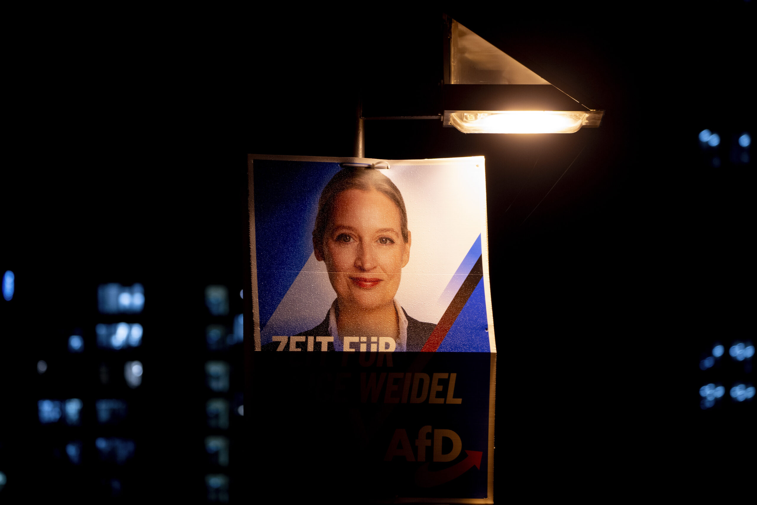 En valgplakat for AfD henger på en lyktestolpe i Frankfurt den 20. februar 2025. Foto: Michael Probst / AP / NTB.