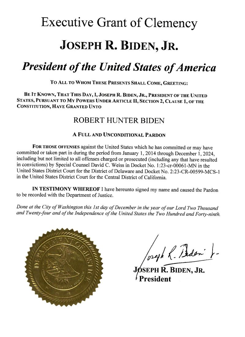 I sine siste timer som president i januar 2025 benådet Joe Biden en rekke personer. Det har vakt sterke reaksjoner. Benådningene var forebyggende mot fremtidig straffeforfølgelse for kriminalitet de benådede så langt ikke var siktet for.