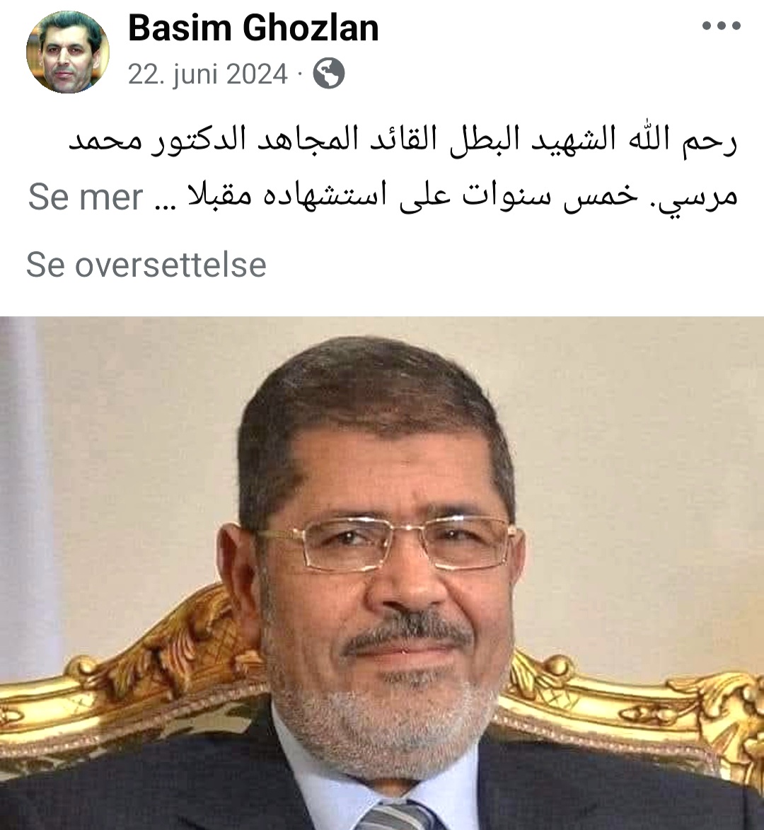 Tre dager senere, 22. juni 2024, skrev han en hyllest til Mohammad Morsi, lederen for Det muslimske brorskap som ble president i Egypt frem til han ble styrtet. Ghozlans hyllest var ved Morsis død, og lyder: