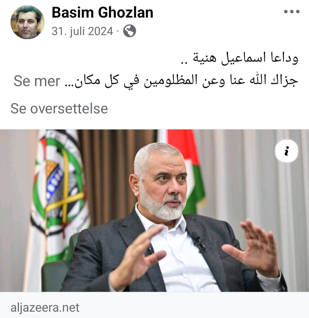 En måned etter det igjen, 31. juli 2024, hyller Basim Ghozlan en av lederne i terrororganisasjonen Hamas. Farvel, Ismael Haniyeh, skriver Ghozlan på Facebook, og videre: