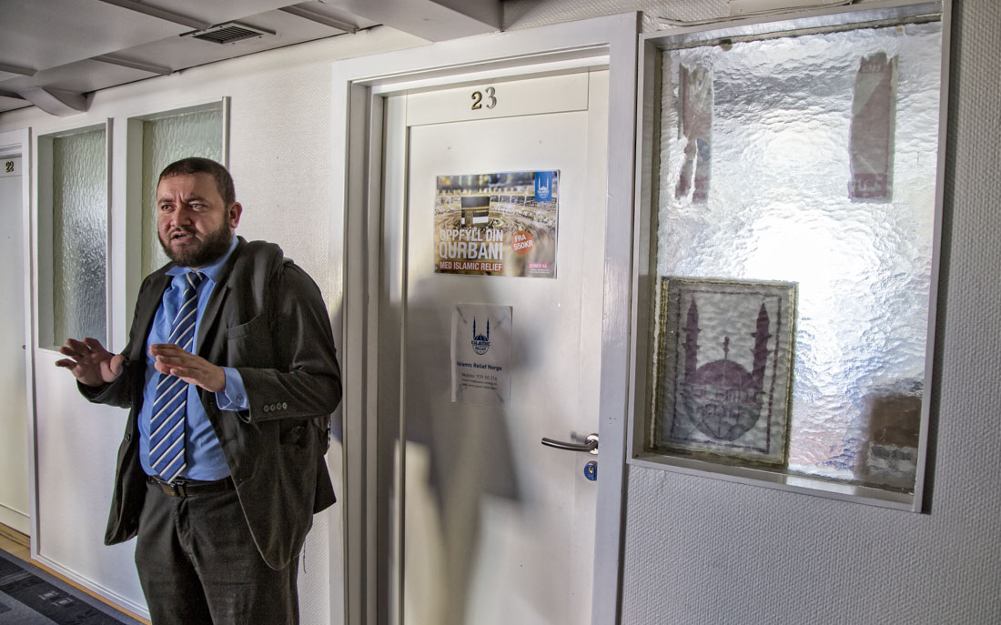 Waleed Hakeem, også kalt Sheikh Waleed Abdul Hakeem, var omviser for journalister i Rabita-moskeen i 2016. Her foran kontoret til Islamic Relief, inne i moskeen. Islamic Relief har et noe frynsete rykte, og noen knytter dem til Muslim Brotherhood. Foto: Bente Haarstad.