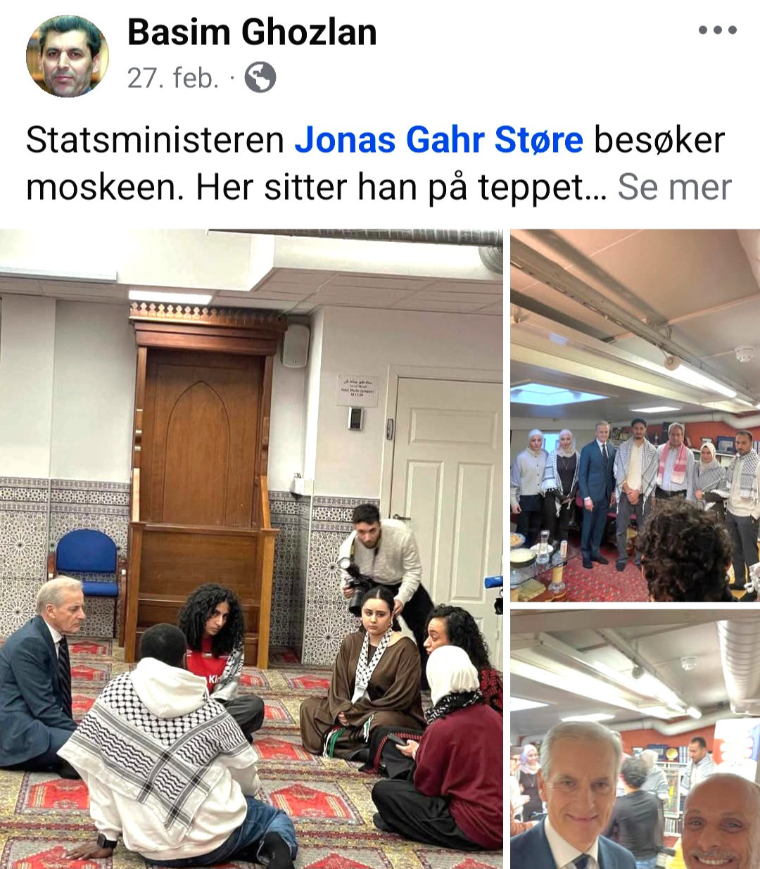 Statsminister Støre satt på teppet i Rabita-moskeen 27. februar 2025, og det var ikke akkurat første gang. Skjermdump.