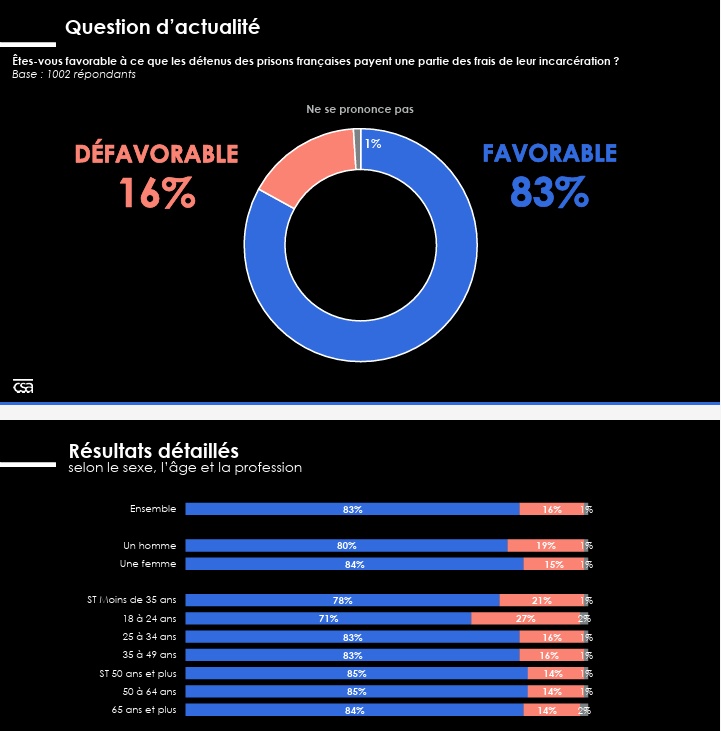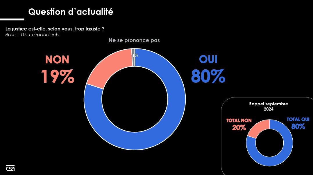Det er kvinnene som feller den hardeste dommen over utviklingen i Frankrike. 85 % mener at rettsvesenet er for mildt, og 76 % sier seg enig i at samfunnet har skapt en fabrikk av barbarer. 80 % av kvinnene vil sette inn hæren i de «vanskelige områdene». Franskmenn vil ha strengere straffer, flere fengsler, og 70 % sier at de ikke lenger kan føle seg trygge noe sted i landet.