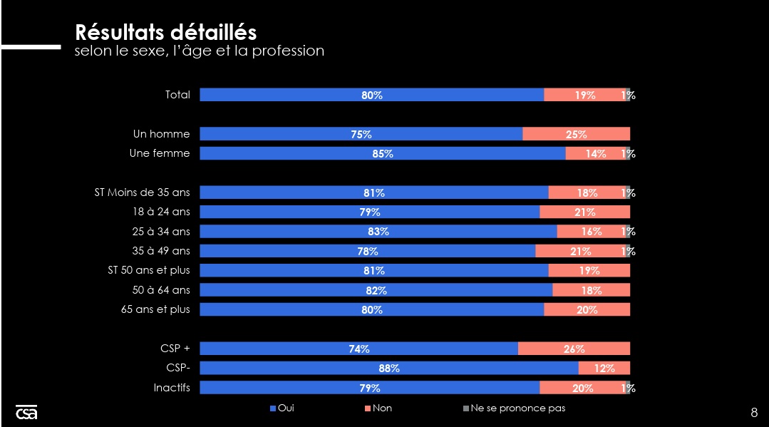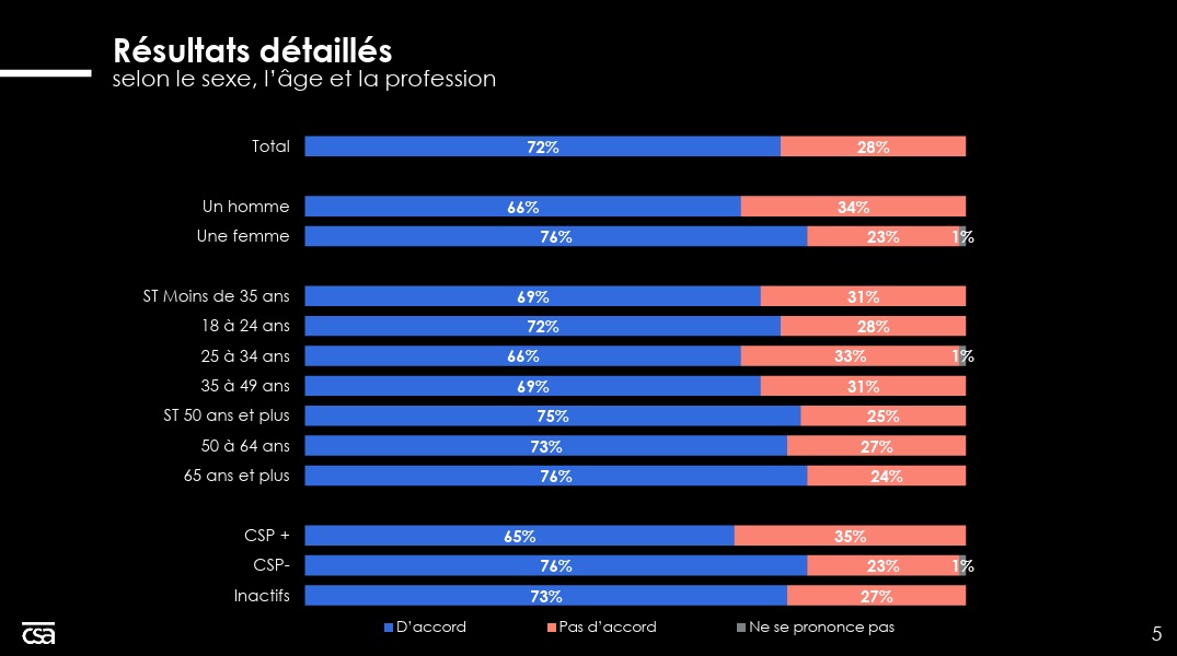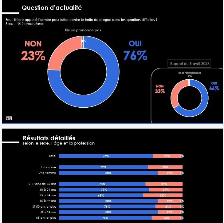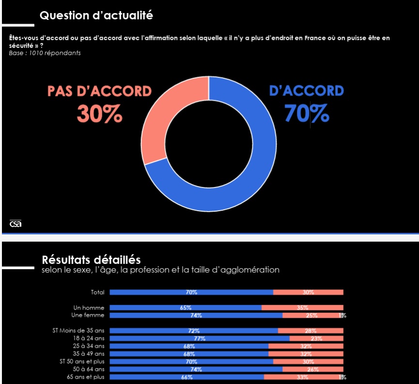 CSA spurte: Er du enig eller uenig i påstanden om at «det ikke lenger er noe sted i Frankrike hvor man kan være trygg»? Totalt svarte 70 % at det ikke lenger er noe sted i Frankrike hvor man kan føle seg trygg. Blant kvinnene mente 74 % at de ikke kunne føle seg trygge noe sted.