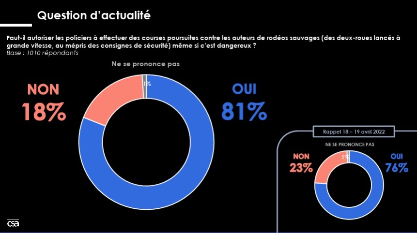 Franskmenn vil også gi politiet rett til å forfølge forbrytere selv om det er trafikkfarlig. På dette spørsmålet: Bør politiet få lov til å jage folk som driver med ville rodeo (tohjulinger kjørt i høy hastighet, i strid med sikkerhetsforskriftene) selv om det er farlig? svarte 81 % «ja».