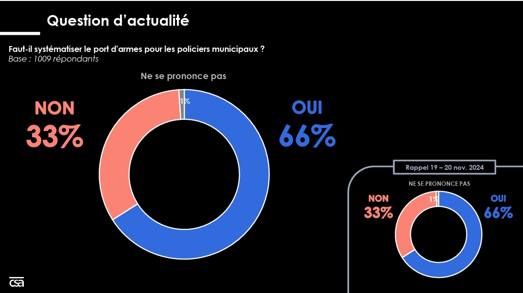 Det franske politiet er tredelt, og det laveste nivået er «kommunepolitiet», såkalte policiers municipaux. Disse har ansvaret for offentlig orden, sikkerhet og ro på lokalnivå, hvilket ofte kan være risikofylt, selv om oppdragene deres som oftest inkluderer trafikkregulering, overvåking av offentlige områder, forebygging av kriminalitet, samt håndheving av lokale lover og forskrifter (som f.eks. forbud mot forsøpling, støy, osv.). Kommunepolitiet kan kun bære våpen hvis det er godkjent av lokale myndigheter. På spørsmål om alle disse burde bære våpen som standard, svarte 66 % av franskmenn «ja». Dette er opp fra 59 % som svarte ja i 2024.