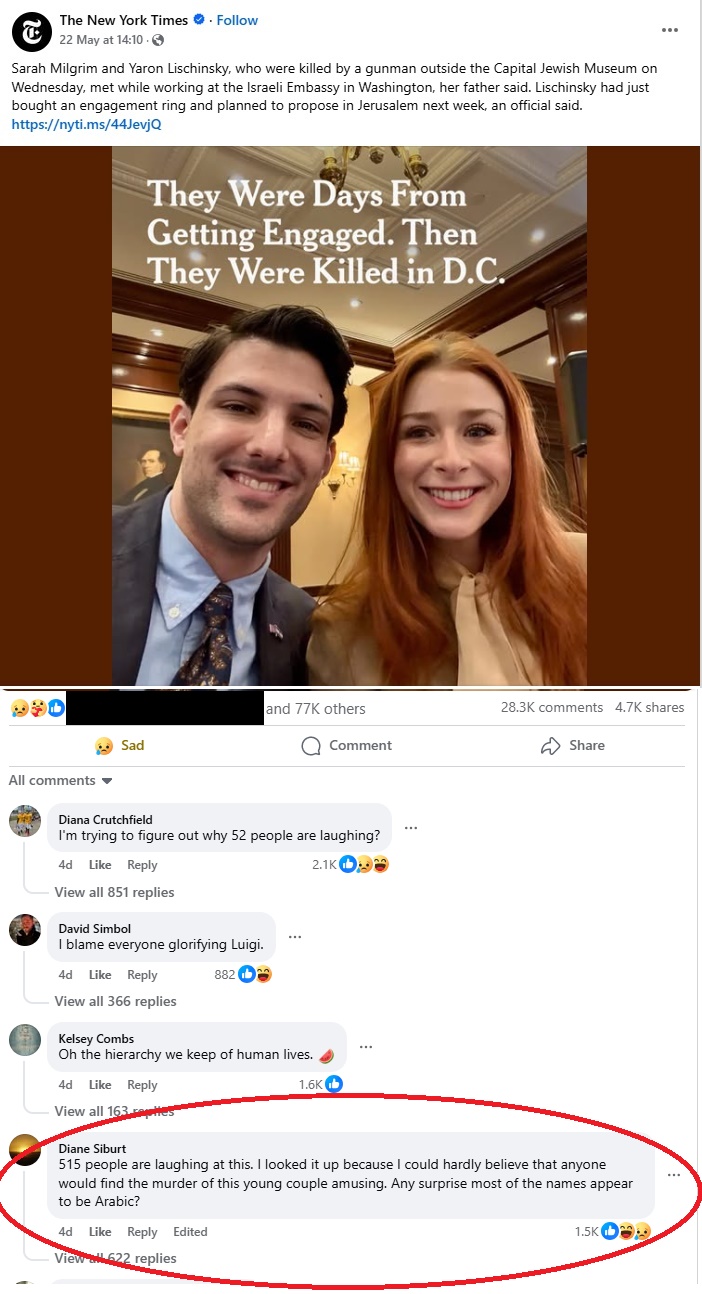 Avisen New York Times la ut en artikkel om drapene på Facebook. Reaksjonene på artikkelen, i form av latterfjes, viste et skremmende generelt hat mot jøder.