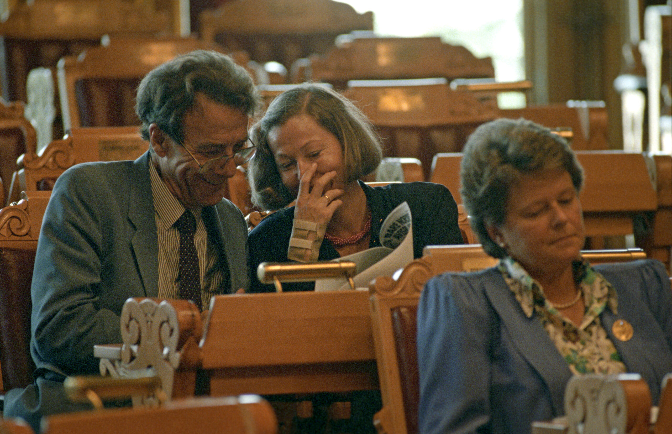Høyre-leder Kaci Kullmann Five, Reiulf Steen (Ap) og statsminister Gro Harlem Brundtland (Ap) under en EØS-debatt i Stortinget den 16. august 1991. Året etter ble EØS-avtalen vedtatt med Høyre og Arbeiderpartiets stemmer. Representanter fra FrP og KrF stemte også for. Foto: Lise Åserud / NTB.