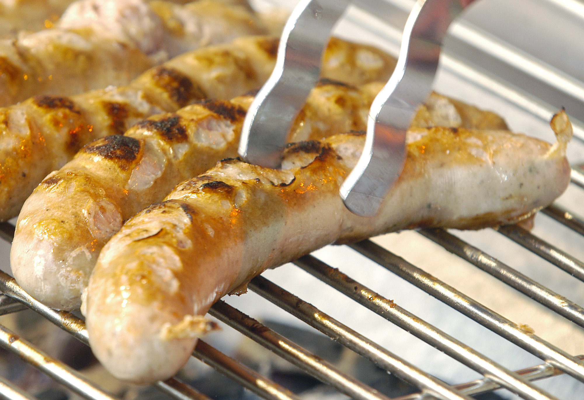 Pølser ligger på grillen under en stor Rostbratwurst-grillfest i Erfurt i Thüringen. Foto: Jens Meyer / AP / NTB.