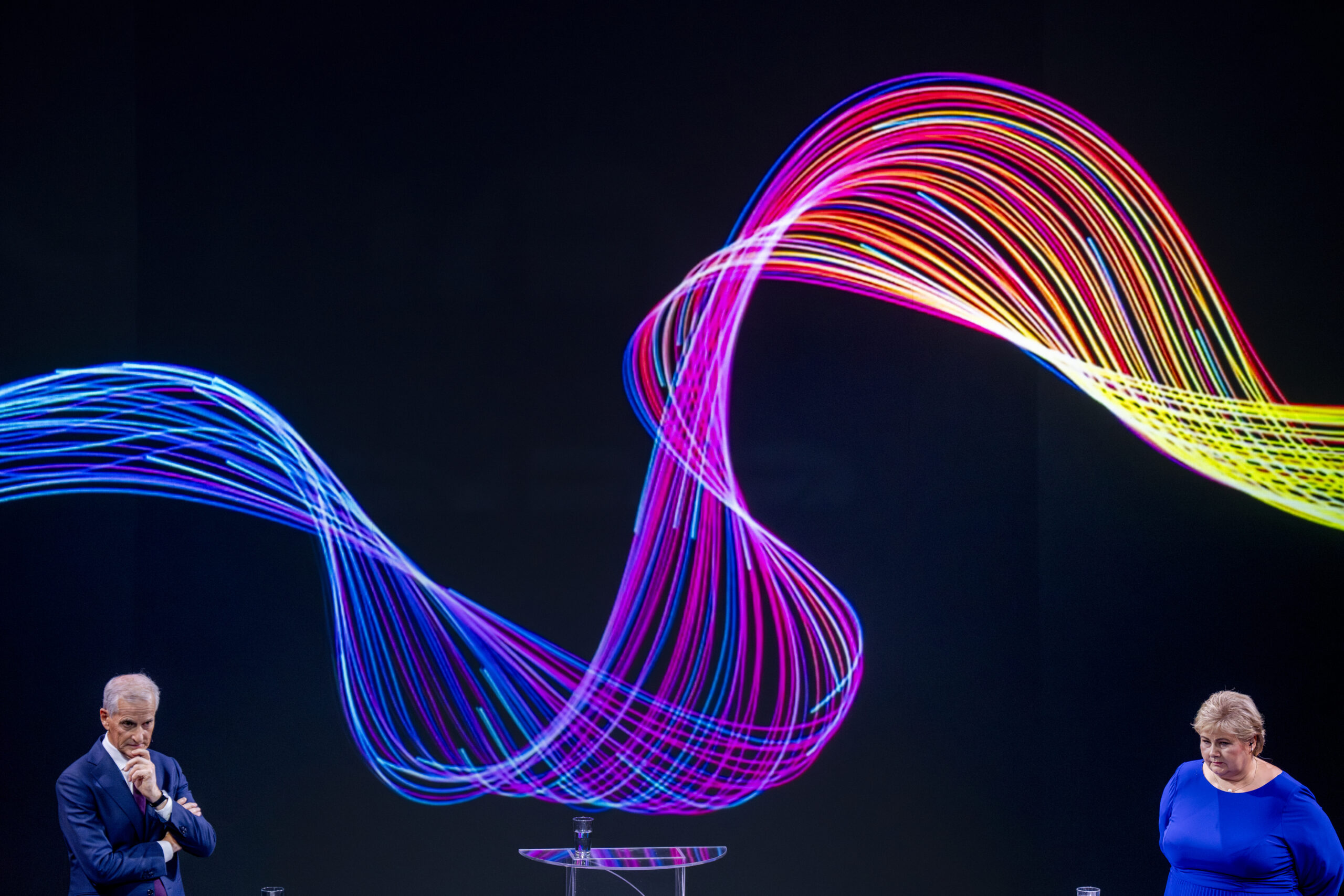 Jonas Gahr Støre og Høyre-leder Erna Solberg deltar i partilederdebatten på Arendalsuka den 15. august 2024. Foto: Heiko Junge / NTB.