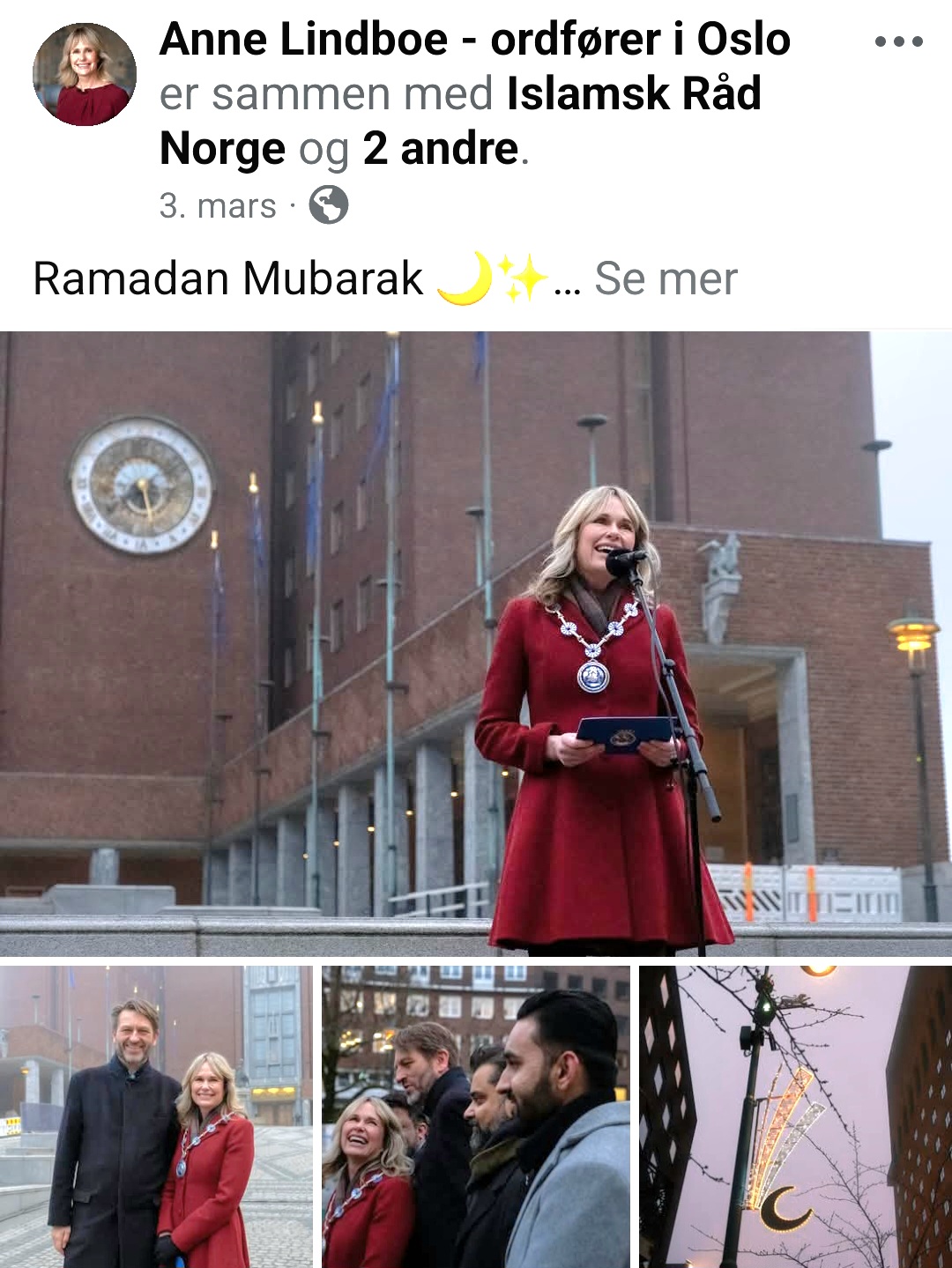 Høyres ordfører, Anne Lindboe, talte selv under åpningen av ramadan-pyntet hovedstad i mars. Noe som varte omtrent helt frem til påsken. Det ble ingen markering av den kristne høytiden. Skjermdump Facebook.