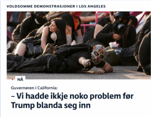 Norske mediers dekning av opptøyene i LA gjør Trump til syndebukk og fremstiller protestene som en rettferdig kamp. I gårsdagens Dagsrevyen står USA-korrespondent Tove Bjørgaas på amerikansk jord, svartmaler halve landet og driver aktivistisk journalistikk som bidrar til at mange nordmenn har et ensidig og fiendtlig syn på Trump og hans velgere.