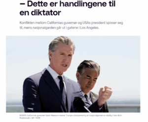 Med overskriften «Ekspert: Dette er handlingene til en diktator» setter TV2 tonen ved å gjengi guvernør Gavin Newsoms beskyldning om at Trumps ordre om å innkalle nasjonalgarden uten delstatens samtykke er ulovlig og en alvorlig krenkelse av Californias suverenitet.