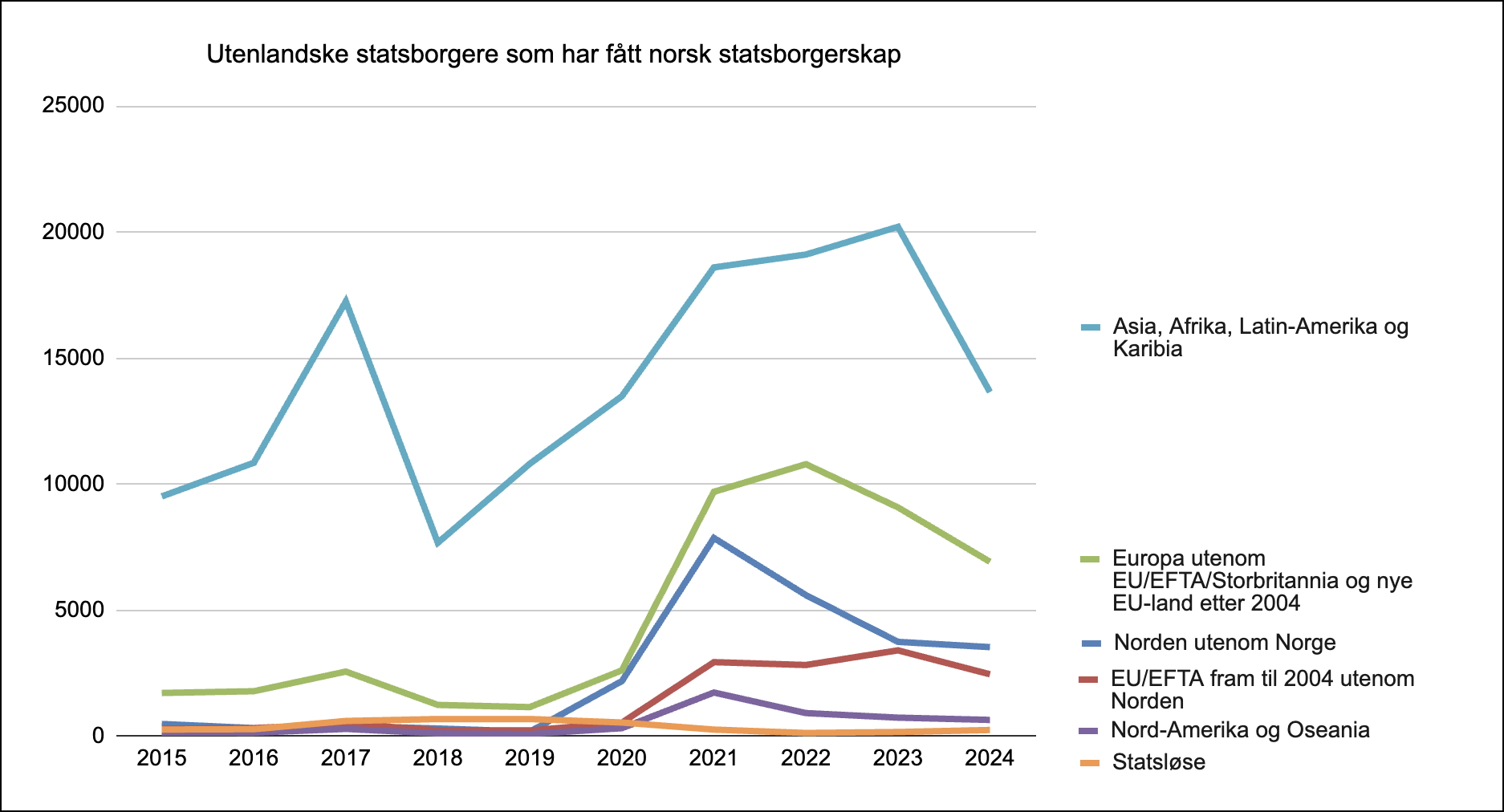 I tidsrommet 2015–2024 er 236.174 personer, altså nesten en kvart million, blitt tildelt norsk statsborgerskap.