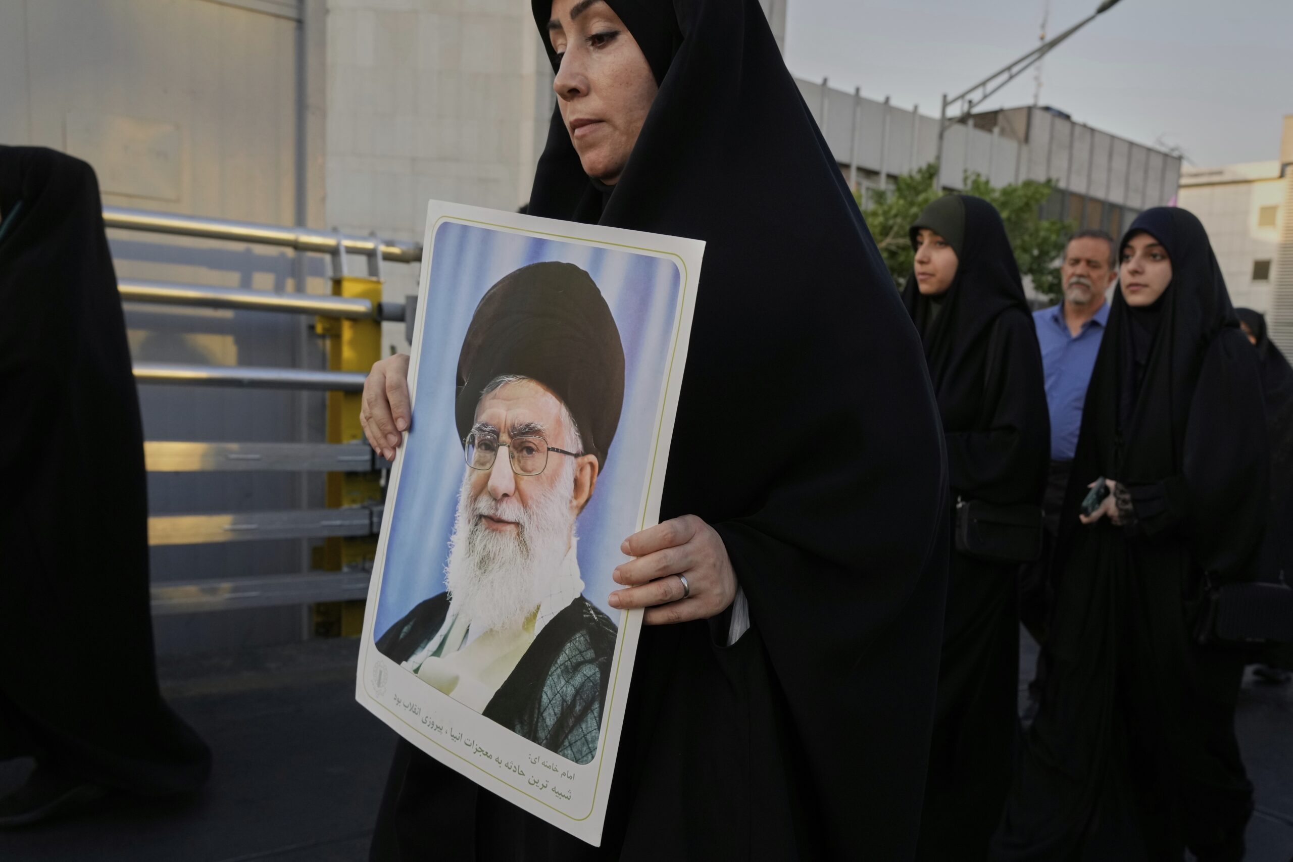 En kvinne bærer et plakat av Irans øverste leder ayatolla Ali Khamenei under en demonstrasjon i anledning den sjiamuslimske høytiden Eid al-Ghadir, som feirer profeten Muhammeds utnevnelse av sin etterfølger, Ali, som er æret som den første sjia-imamen, i Teheran den 14. juni 2025. Foto: Vahid Salemi / AP / NTB.