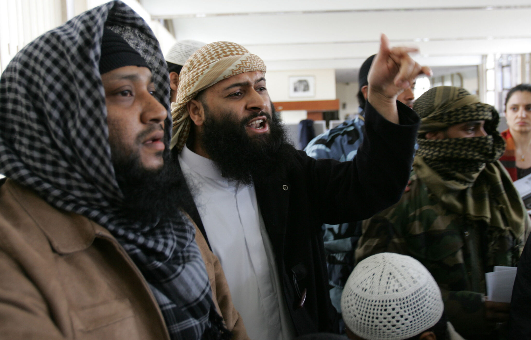 Muslimske demonstranter avbryter en pressekonferanse holdt av Muslim Council of Great Britain i den sentrale moskeen i London den 19. april 2005. Muslim Council holdt et mediearrangement for å oppfordre muslimer til å stemme i det britiske parlamentsvalget 5. mai 2005. Foto: Alastair Grant / AP / NTB.