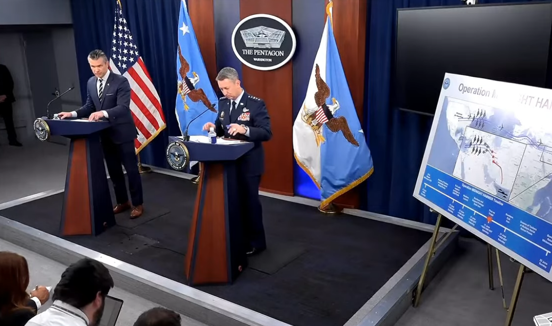 Takk, herr minister, for å anerkjenne alle våre folk som utfører nasjonens arbeid. Godt å se alle denne tidlige søndagsmorgenen. I natt, på presidentens ordre, gjennomførte USAs sentralkommando, under ledelse av general Eric Carrillo, Operasjon Midnight Hammer – et målrettet og presist angrep mot tre iranske kjernefysiske anlegg. Dette var et komplekst og høyrisikooppdrag utført med eksepsjonell dyktighet og disiplin av våre felles styrker.