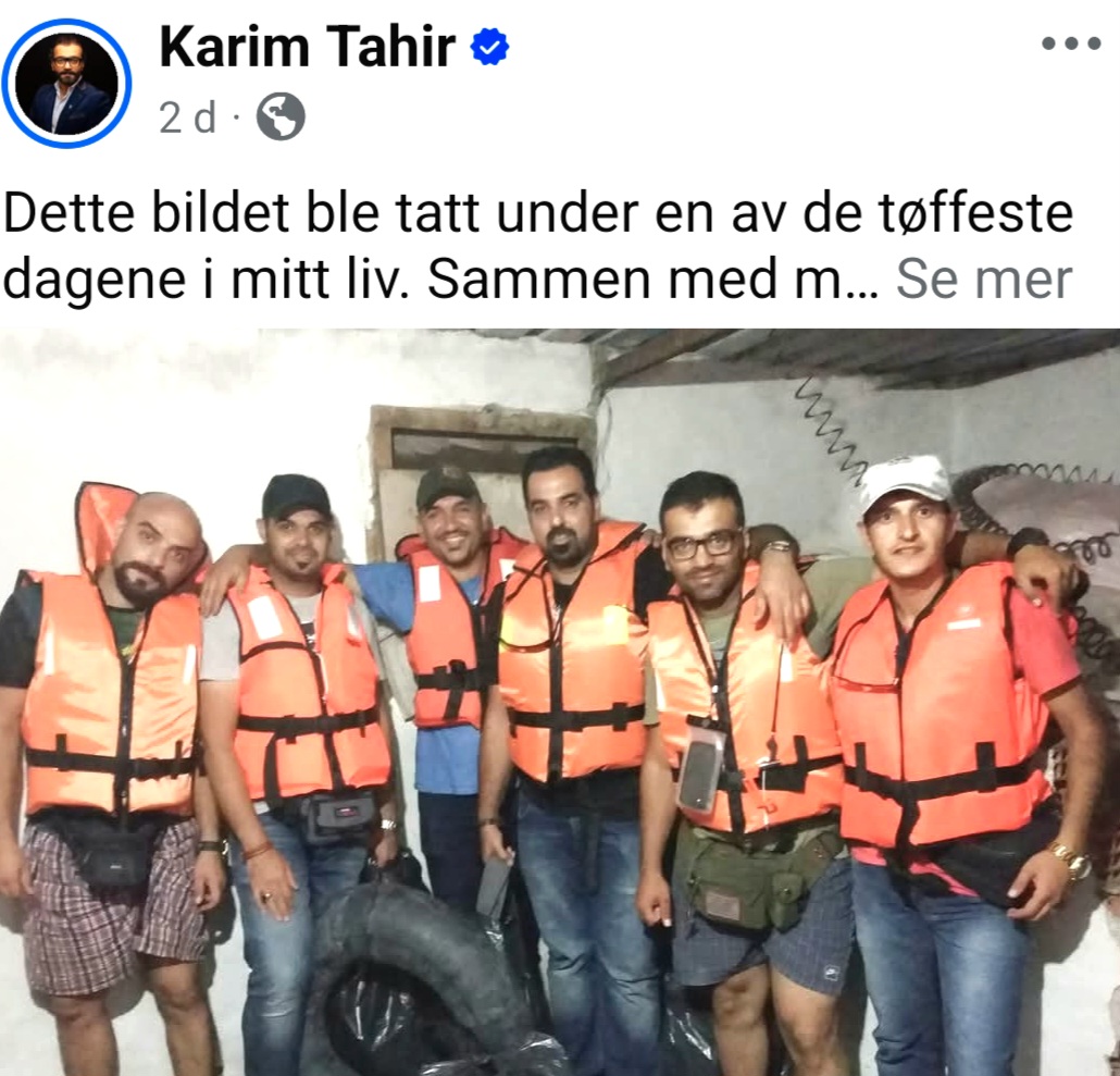 Karim Tahir la nettopp ut dette bildet av seg selv som båtflyktning. Han reiste via Tyrkia og søkte asyl i Norge i august 2016. På Facebook skriver han blant annet: «Å være flyktning er ikke et valg. Det er en tvungen reise – over farlige hav, gjennom mørke skoger, brennende ørkener og på veier fulle av menneskesmuglere og kriminelle nettverk som handler med mennesker og organer. Mange overlever ikke reisen. Men noen gjør det – og jeg var en av dem.» Skjermdump.