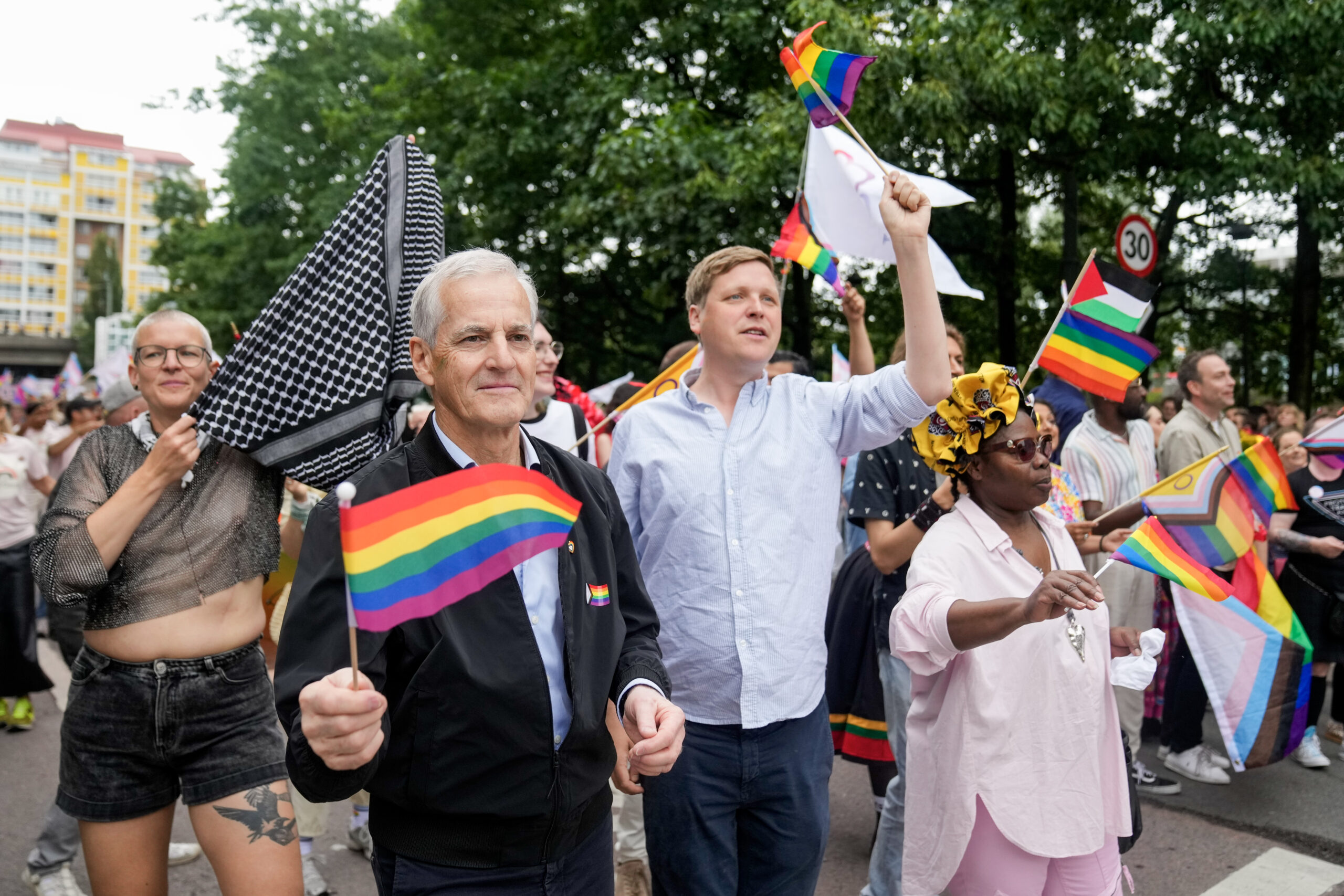 Statsminister Jonas Gahr Støre og utviklingsminister Åsmund Aukrust under Pride-paraden i Oslo. Pride-paraden feirer skeivt mangfold, og går fra Grønland til Pride Park på Kontraskjæret i Oslo lørdag ettermiddag.