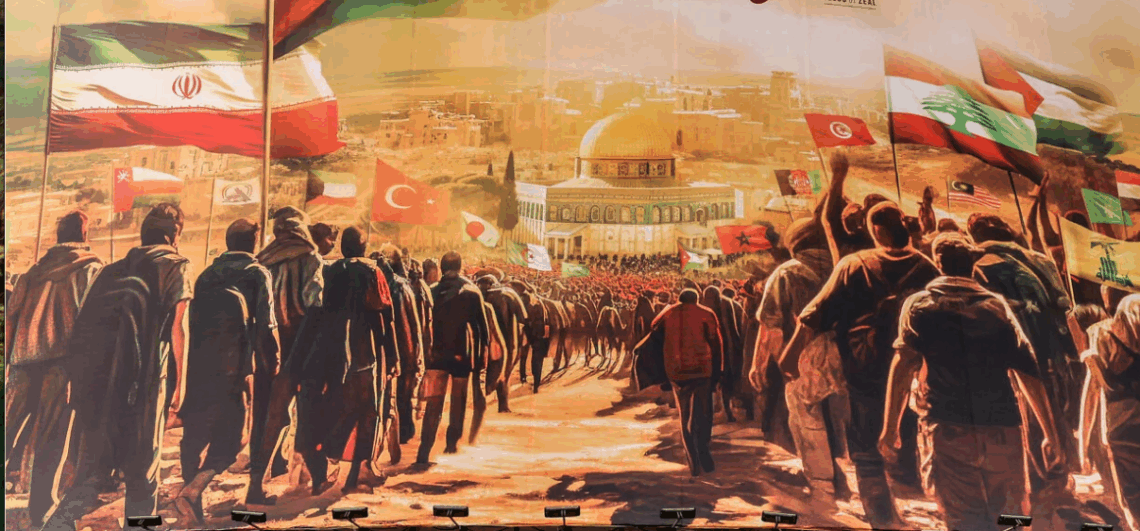 25. oktober 2023 – to uker etter overraskelsesangrepet 7. oktober – avduket regimet et gigantisk billboard på Valiasr-plassen i Tehran. Det viser muslimer fra hele verden som marsjerer under sine nasjonale eller religiøse flagg mot Klippemoskeen i Jerusalem. Muslimske masser skulle feire «befrielsen», symbolikken var ikke til å ta feil av. Dette var et varsel om at «frigjøringen» – Israels ødeleggelse – var nær forestående.