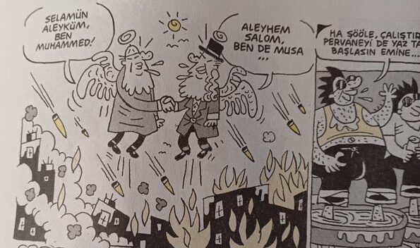 I Tyrkia er to tegnere pågrepet i forbindelse med en tegning som viser Muhammed som håndhilser på Moses i himmelen, mens det raser krig på jorden under dem. Det er en hyllest til fred og fordragelighet, men i Erdogans Tyrkia er det blasfemi.