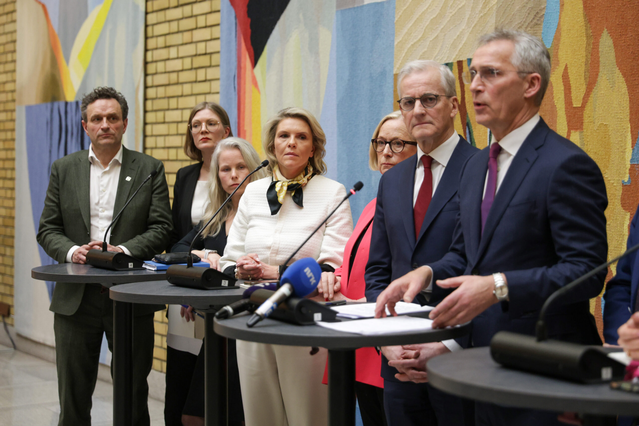 Statsminister Jonas Gahr Støre (Ap) og finansminister Jens Stoltenberg (Ap) holder pressekonferanse sammen med de parlamentariske lederne på Stortinget etter samtalene om økonomisk støtte til Ukraina den 6. mars 2025. Foto: Amanda Pedersen Giske / NTB.